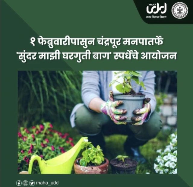 चंद्रपूर  :-  ३१,जानेवारी – चंद्रपूर महानगरपालिकेतर्फे माझी वसुंधरा व राष्ट्रीय शुद्ध हवा कार्यक्रमांतर्गत शहर सुंदर व हरित करण्यासाठी माझे योगदान या थीमवर सुंदर माझी घरगुती बाग स्पर्धा घेण्यात येणार असुन यात घरी छोटी बाग असणाऱ्या/ नविन बाग तयार करू इच्छिणाऱ्या तसेच टेरेस गार्डन/किचन गार्डन असणाऱ्या किंवा तयार करू इच्छिणाऱ्या स्पर्धकांना यात भाग घेता येणार आहे.