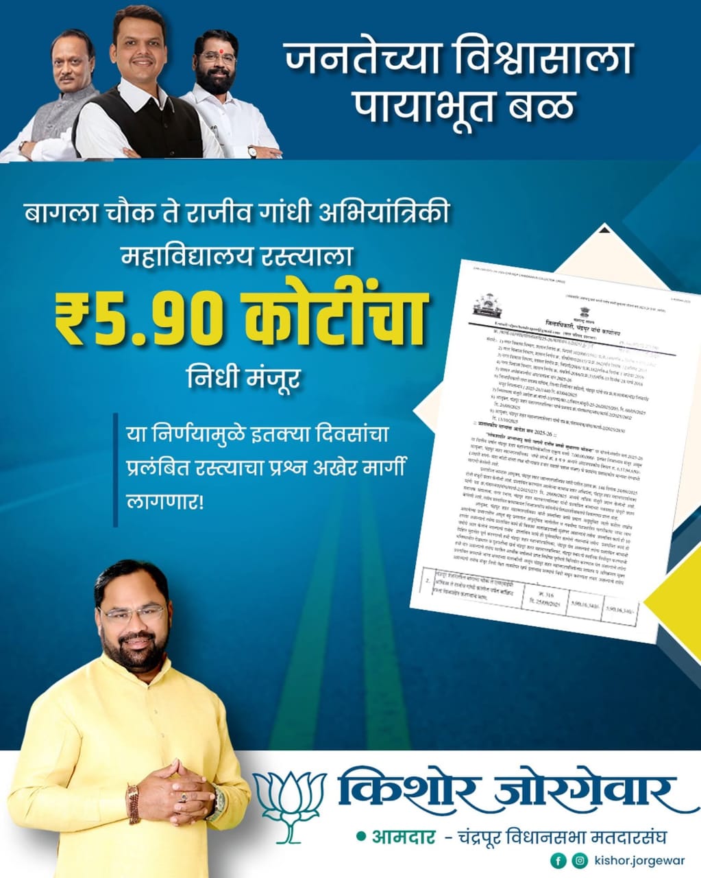 ┬ард╕рд╛рддрддреНрдпрдкреВрд░реНрдг рдкреНрд░рдпрддреНрдирд╛рдВрдирд╛ рдпрд╢! тАФ рдЖрдорджрд╛рд░ рдХрд┐рд╢реЛрд░ рдЬреЛрд░рдЧреЗрд╡рд╛рд░ рдпрд╛рдВрдЪреНрдпрд╛ рдкреНрд░рдпрддреНрдирд╛рдВрдирд╛ рдпрд╢, рдмрд╛рдЧрд▓рд╛ рдЪреМрдХ рддреЗ рд░рд╛рдЬреАрд╡ рдЧрд╛рдВрдзреА рдЕрднрд┐рдпрд╛рдВрддреНрд░рд┐рдХреА рдорд╣рд╛рд╡рд┐рджреНрдпрд╛рд▓рдп рд░рд╕реНрддреНрдпрд╛рдЪреНрдпрд╛ рд╡рд┐рдХрд╛рд╕рд╛рд╕рд╛рдареА тВ╣5.90 рдХреЛрдЯреАрдВрдЪрд╛ рдирд┐рдзреА рдордВрдЬреВрд░