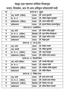 चंद्रपूर :-  आगामी चंद्रपूर महानगरपालिका निवडणुकीच्य पार्श्वभूमीवर राजकीय हालचालींना वेग आला असून, सर्व प्रभाग मधील विविध प्रभागांसाठी भारतीय जनता पक्ष व शिवसेनेच्या उमेदवारांची अधिकृत यादी जाहीर करण्यात आली आहे. उमेदवारांच्या नावांमुळे संबंधित प्रभागांमध्ये प्रचाराला आता खऱ्या अर्थाने सुरुवात झाली असून, राजकीय वातावरण चांगलेच तापले आहे.